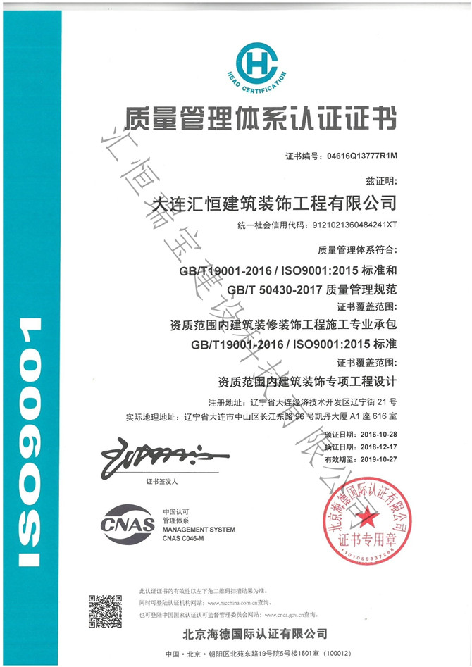 質(zhì)量管理體系認(rèn)證證書