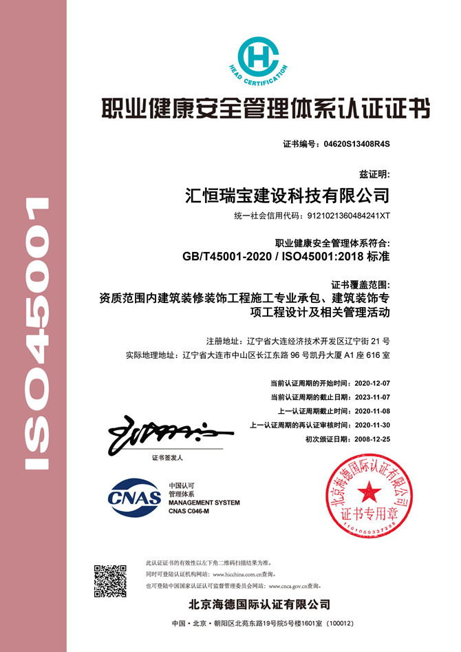職業(yè)健康安全管理體系認證證書