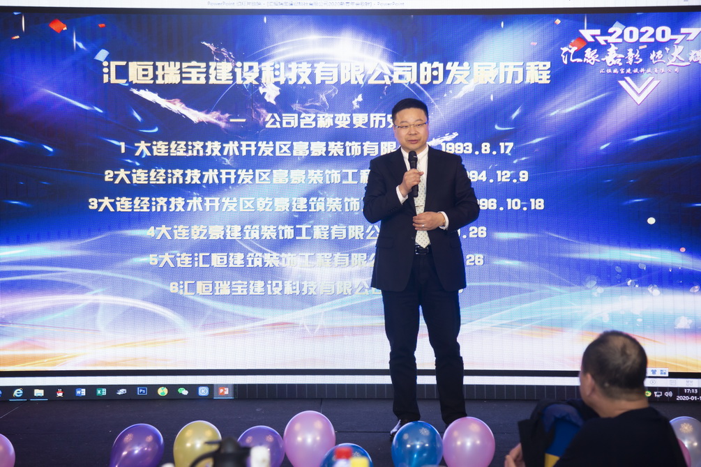 匯恒瑞寶建設(shè)科技公司總經(jīng)理傅義東通過VCR回顧了"匯恒瑞寶"的發(fā)展歷程,對(duì)未來的發(fā)展方向作出重要講話